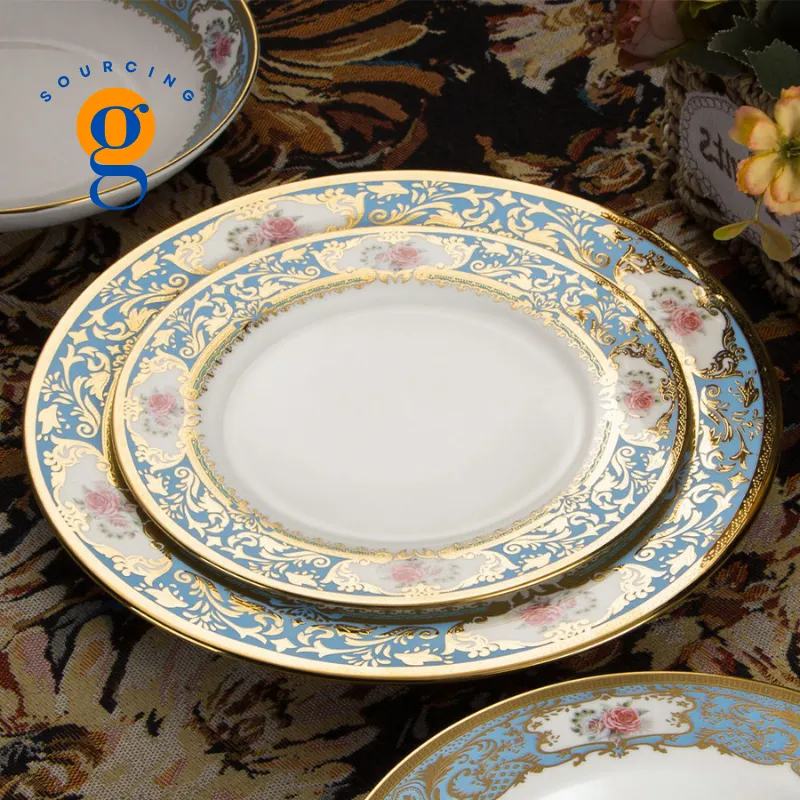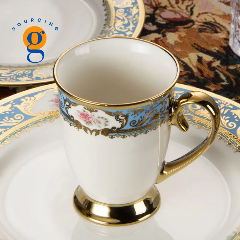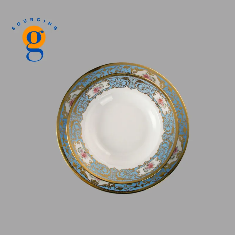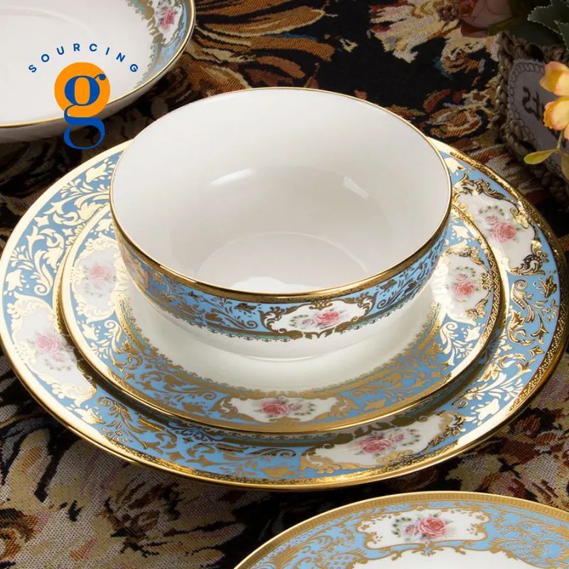 High End Restaurant Under Glazed Floral Pattern with Gold Trim Bone Decal Plates Cup Dinnerware Sets