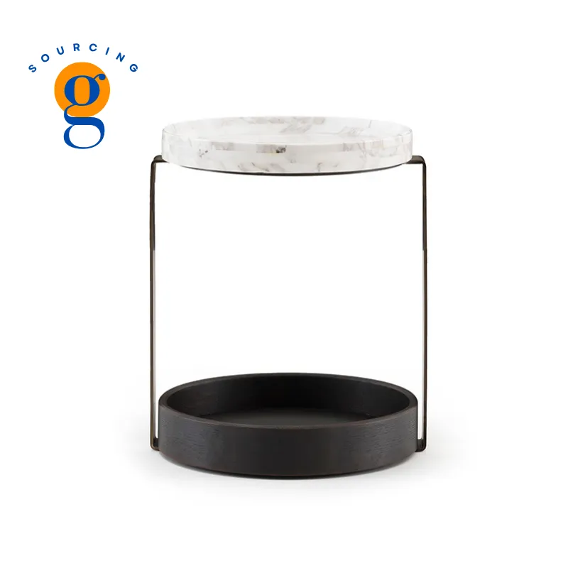 GDS-ST1701H: A round side table with a light-colored marble top featuring textured veining. The unique open metal frame with a dark bronze finish curves upward to support the top and includes an integrated round shallow tray below.