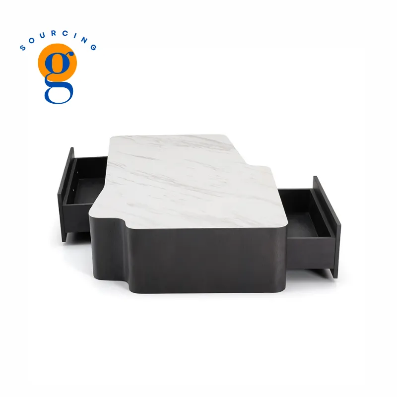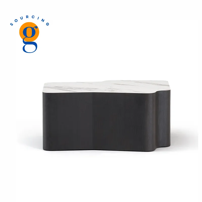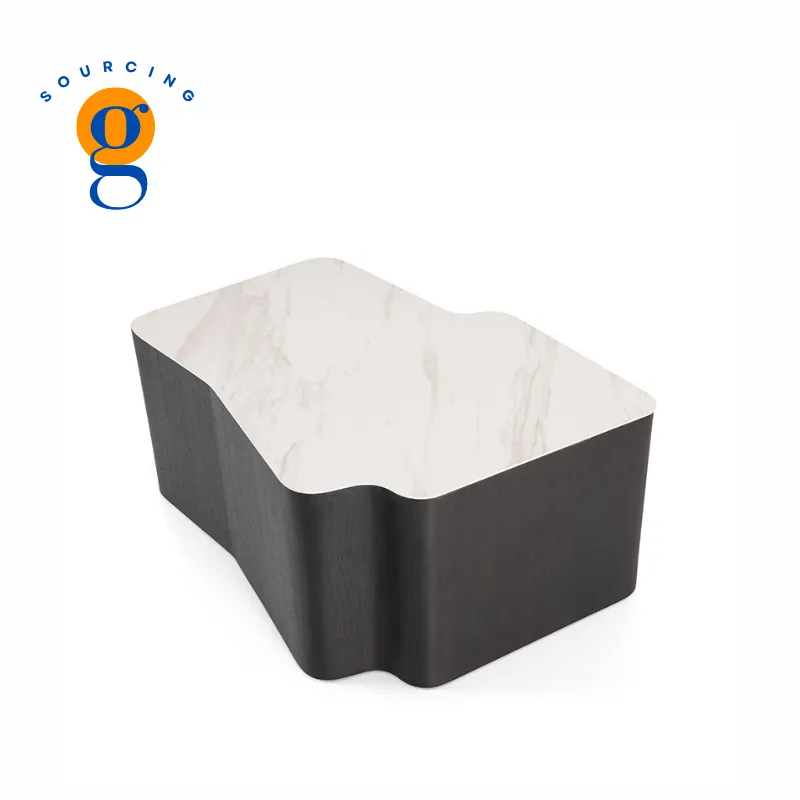 GDS-ST812A: A low rectangular coffee table with a distinctive wavy or undulating side profile featuring a white marble top and dark wood base, creating an organic and sculptural design element.